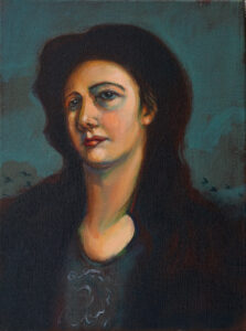 This painting is from the cloud diaries series. It shows the queen of the ravens, a fictional character. This painting has been previously exhibited in the Unlikely Clan show “Modern Myths” at the Glasgow Gallery in 2025.