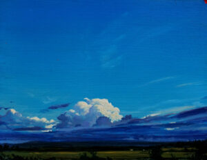 A wee study for the big painting. I spend a lot of time travelling around Scotland, drawing and painting. This painting is from a layby near Stirling looking across the hills. I was fascinated by the shape of the cloud, it reminded me of the cloud paintings by William Turner. I’ve tried to catch the magnificence of the cloud. This study was based on a drawing done on the day.