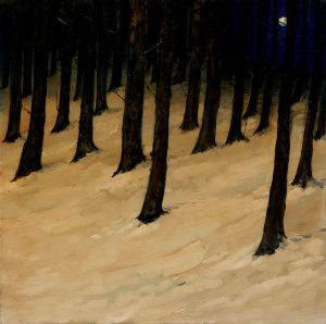 Behind my house is a hill, called Hoods Hill. Quite often I walk up there in the evening with the dog. There’s a stand of larch trees. A couple of winters ago I was up there, and the snow had blown in amongst the trees. The moon was rising and I could see it just where the hill folded. There was a tremendous mix of light and line and hues of colour.