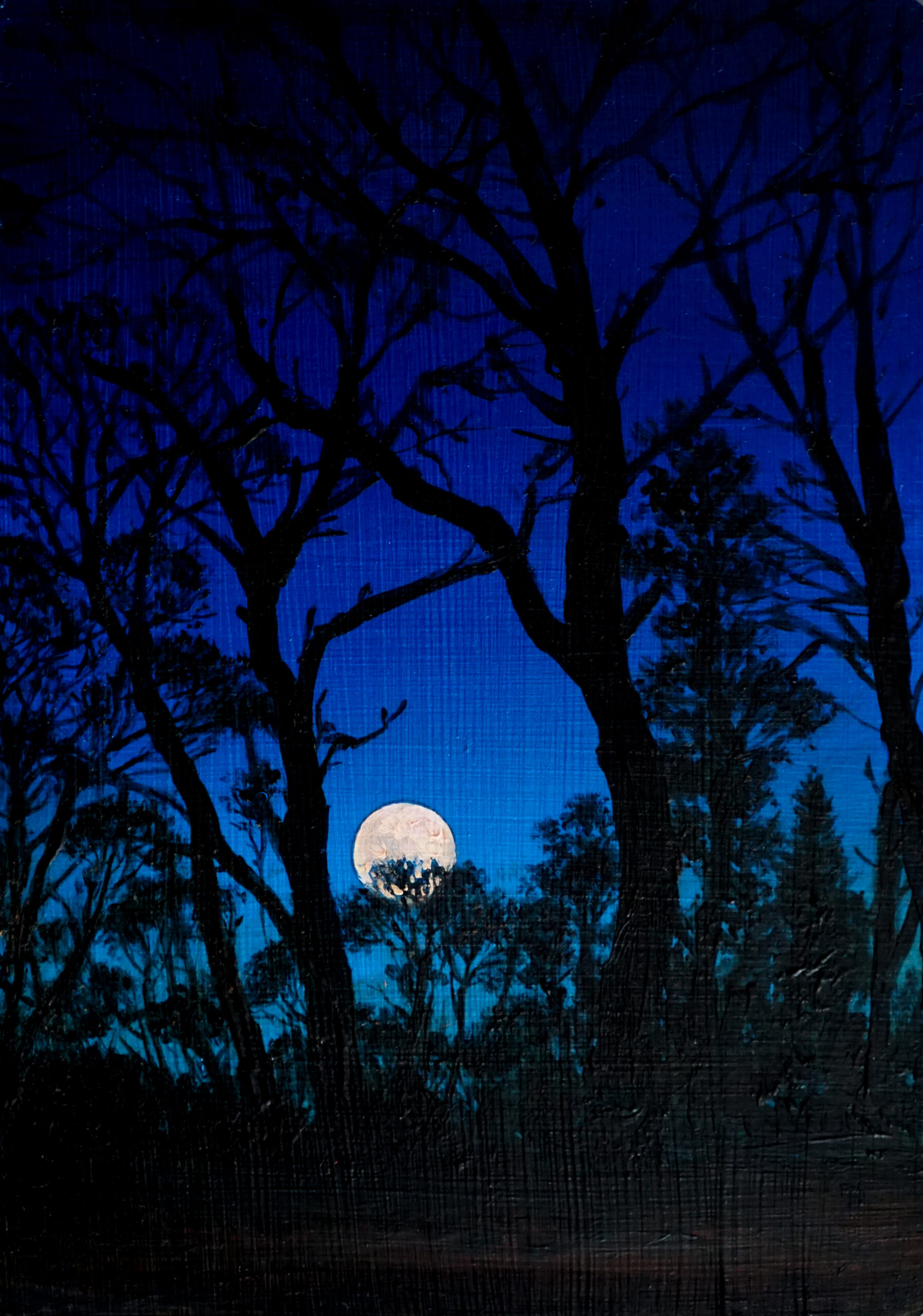 Sometimes the moon just pops up. I was recovering from my hip operation and walking around the garden on a regular basis as part of my physio. Perhaps it was because I was so slow on the walking sticks as the moon was able to creep up on me. There was something lovely about turning round and seeing the full moon suddenly there amongst the trees. This study is an attempt to catch it.